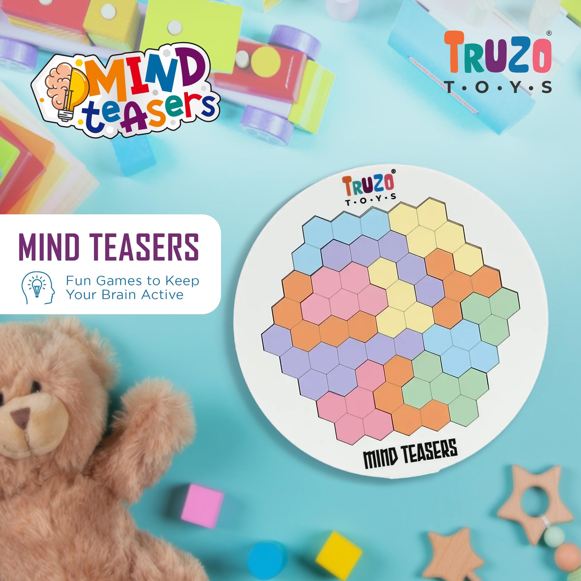 Boost your child's focus and memory with Mind Teasers game Truzo. This educational puzzle includes 14 pieces in 7 vibrant colors, perfect for kids 4+ years. Developed by industry experts, this brain booster game promotes cognitive development while providing fun and challenging entertainment. keerthi Toys Rajahmundry
