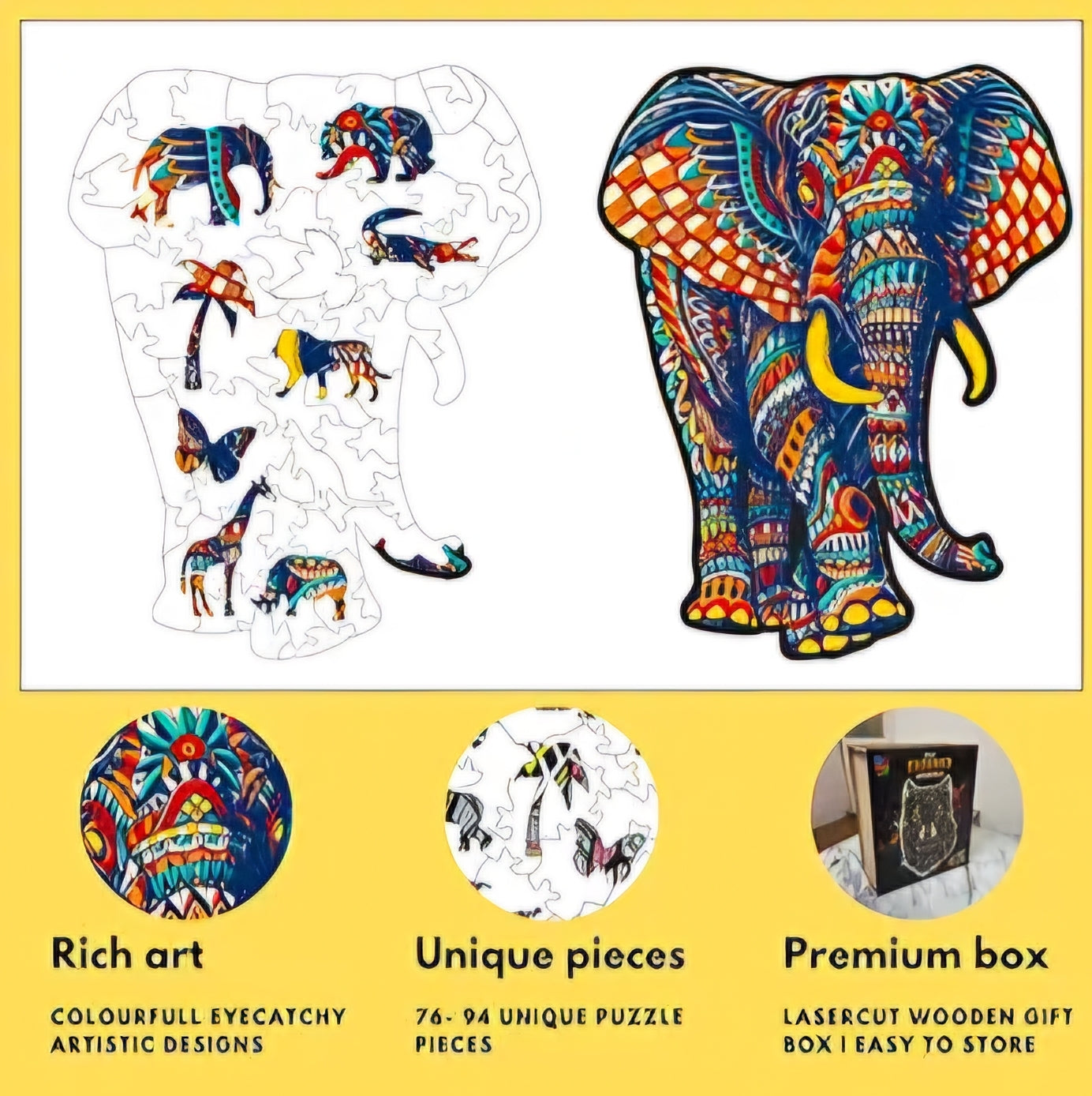Wooden Figured Puzzle Play Together Puzzle for All Ages 9 Artistic Designs with Unique Animal Figured Pieces Premium Wood Box